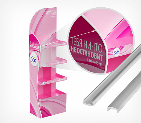 Гибкий профиль FLEXLINE для рекламных дисплеев — это мягкий П-образный профиль из гибкого ПВХ, специально разработанный для обрамления торцов рекламных дисплеев и выставочных конструкций. Преимущества FLEXLINE: придаёт изделиям завершённый и эстетичный внешний вид; надёжная защита от механических повреждений и влаги; лёгкий монтаж без заломов благодаря гибкости материала, что позволяет легко обогнуть конструкции любой формы. Для лучшего сцепления с поверхностью рекомендуется использовать профиль с клеем.