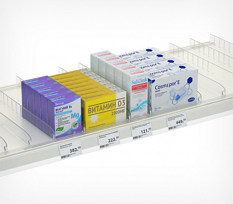 Применяется для организации на полке небольших легких товаров. Идеальное решение для организации выкладки сигарет, лекарств, парфюмерии, косметики.