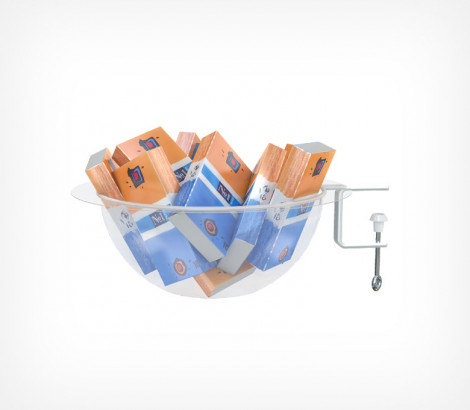 Дисплей-накопитель BOWL комплект — это полукруглый пластиковый контейнер для выкладки мелкого товара, например конфет, ручек, косметики или лекарств. Он состоит из двух секций: нижней (чаши) и верхней (крышки с отверстием для удобного доступа к товарам, металлический держатель-кольцо, который позволяет крепить дисплей на полку толщиной до 40 мм.). Верхняя и нижняя части крепятся с помощью степлера. Дисплей BOWL используют в аптеках, магазинах парфюмерии, на кассах, прилавках или рядом с сопутствующими товарами. Он популярен благодаря простоте использования и доступной цене